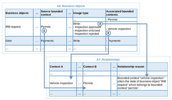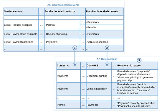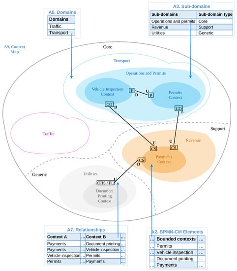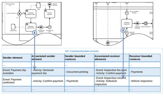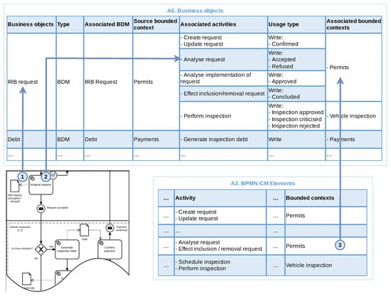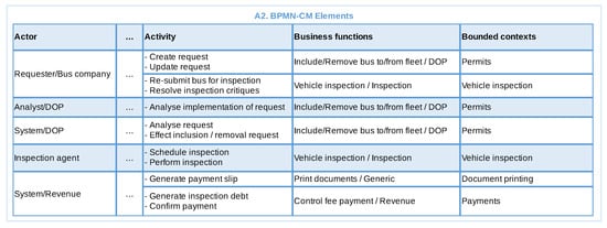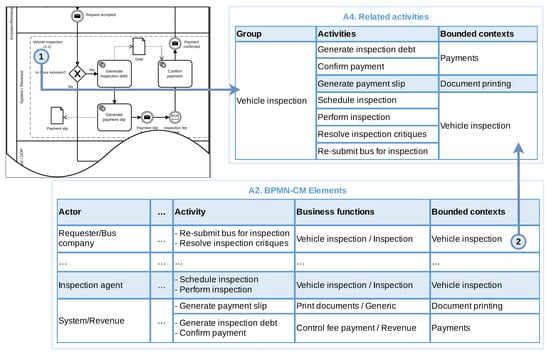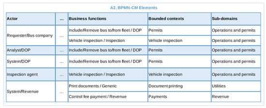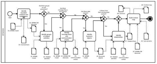 Moreover, one of the ways to properly identify software services taking into account business capabilities is through the business view, which can be done by the analysis of business processes []. It is well established that business process models provide system analysts with information that captures realistic business needs, being crucial for the requirements elicitation activity, with noticeable improvement in the quantity and quality of the requirements collected [,]. Thus, it is only natural that business process models would be used in conjunction with DDD to improve the requirements gathering and design of software systems. In complex scenarios, business processes can use more than one service, belonging to different areas or business contexts to perform their operations, providing important insights in the modelling of more complex logic, including the interaction between different services [].
