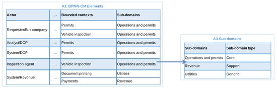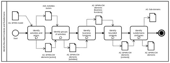 The first step in our approach is to identify the bounded contexts and the subdomains. This step receives as input the BPMN model (A1) and produces two artefacts: BPMN-CM (BPMN Context Map) elements (A2) and Sub-domains (A3). A2 contains different elements of the BPMN model while A3 contains the subdomains names and types. Figure 4 presents a BPMN description of this step, which will be detailed in the sequence.