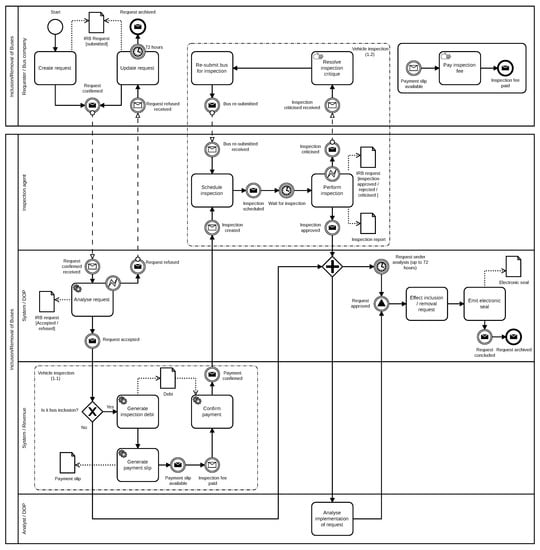 The BPM2DDD approach has been developed and applied between June/2019 and March/2020 as part of a real software development project in a Brazilian governmental organ of urban transit control. One of the authors was part of an outsourced team composed of six developers working together with a team of nine developers in a project for the reengineering of their internal systems together with the addition of new functionalities. This project was being developed according to the SPReaD (Service-oriented Process for Reengineering and Devops) process [], an instantiation of the mainstream SOA methodology that defines a set of concrete steps and techniques to support the development of service-oriented systems. This project involved the use of business process models to aid in the requirements elicitation, resulting in the creation of BoAT (Box Analogy Technique) [], an agile-based approach for the capture of business process models in group interviews with domain specialists. BoAT was the technique applied for the construction of the business processes models explored in this work.