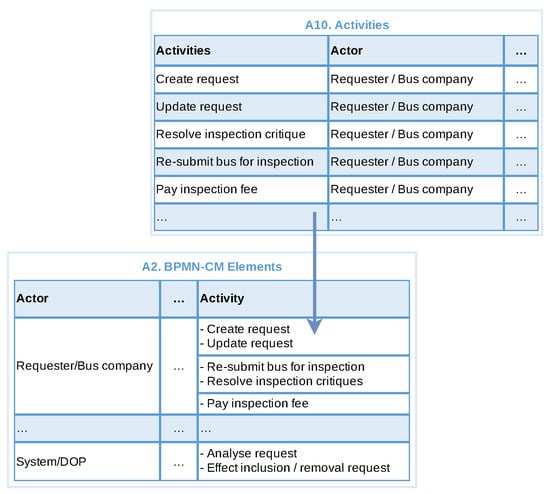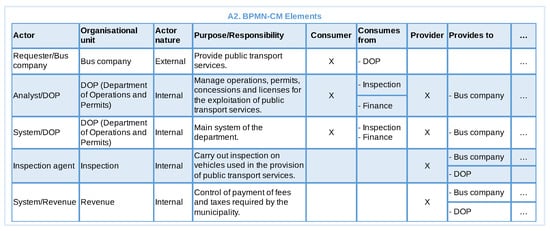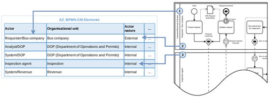 We start by identifying the actors (based on lanes) and activities of the BPMN model, which are stored in A10 (Activities/actors), an auxiliary artefact with the list of actors, their activities, the objective and the obtained results of each activity. Each actor and its respective organisational unit (OU) are added to the A2 artefact, where they are classified according to their nature (internal/external based on its pool in the BPMN) and type (consumer/provider based on whether the actor provides or consumes services - an actor can do both in a single process). We also record the purpose and/or responsibility of each organisational unit in A2 and identify from which OU the actor consumes or provides services to.