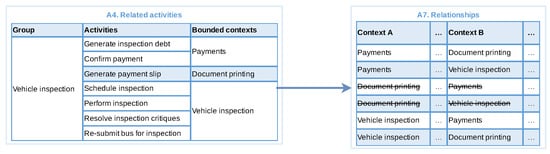 There are approaches that include some degree of systematisation in the construction of DDD artefacts based on the decomposition of functional requirements (usually use cases). For example, Santos et al. [] presented an approach for modelling architectures in agile software development in which one of the steps in their process is the application of DDD to help in the requirements elicitation. Their approach explores “use case models structured by decomposing functionalities in a tree-like form” in which the different groups of use cases correspond to domains and sub-domains and reflect the frontiers used to identify bounded contexts []. Other approaches [,] use functional decomposition of use cases, through the analysis of relationships between system operations (use cases) and data read or written by such operations. These are then modelled as graphs and clustering techniques are used to group data and operations into a business capability, which is then considered as a microservice candidate.