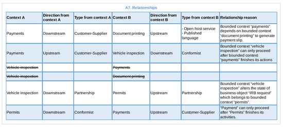 Our evaluation involved the application of the technique in a real project, although with the development team that was involved in its definition. This clearly points to implicit knowledge about DDD, the organisation domain and the technique itself, that contributed to the results obtained with its application. However, DDD has been proposed as an approach to build an “ubiquitous language shared by the team, developers, domain experts, and other participants” []. This require a deep understanding of the business, which BPM2DDD helps in acquiring by systematising its extraction from business process models. Our experience with the review of the context map with domain specialists also demonstrated the importance of having a context map as an effective communication tool. This encourages our technique.