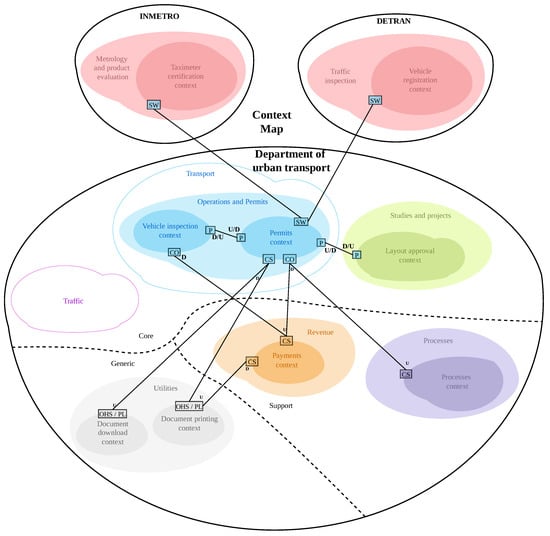 To represent the overview of the domain model, DDD proposes the context mapping approach. In this approach, the context map is a high-level diagram that holistically communicates which bounded contexts are present in the worked domain []. This diagram should be simple enough that technical staff and domain experts can understand and reflect on the realities of the domain. The main responsibility of the context map is to define explicit boundaries between bounded contexts, identifying the points of contact, communication and/or information exchange between them. Thus, each bounded context must have an explicit interface where it decides which models it will share with other contexts []. This information sharing creates a need for a relationship between these contexts and/or between the teams that maintain the systems in these contexts.