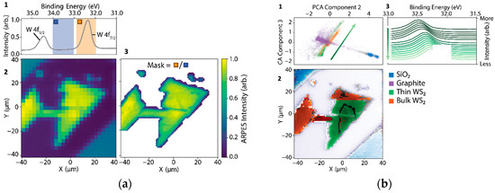 Figure 2a, the resolution was increased by a factor of nine to resolve details in the sample morphology. However, analysis-in-the-loop, which adaptively increases the resolution only on a sample region with intense W 4f core levels (orange divided by blue regions in