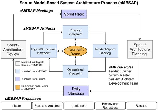 Recent work by Huss et al. has developed an agile MBSE named sMBSAP, which involves a development method that integrates scrum and the MBSAP []. In addition to the main characteristics of scrum and the MBSAP, the sMBSAP emphasizes the engagement of the product development team in customizing the MBSE tool, using UML-based and non-UML-based models to describe the system and leveraging the built-in models (provided in some tools) to arrive at an initial version of the model more quickly. Figure 1 summarizes the sMBSAP meetings, artifacts, processes, and roles. The sMBSAP approach includes five main artifacts: product/sprint backlog, operational viewpoint (OV), logical/functional viewpoint (LV), physical viewpoint (PV), and product increment, as well as four roles: the product owner, scrum master, system architect, and product development team. The sMBSAP updates the artifacts to keep system information within the model. The five sMBSAP phases include initiate, plan and architect, implement, review and retrospect, and release. sMBSAP is application agnostic, as it can be applied to other software or engineered systems.