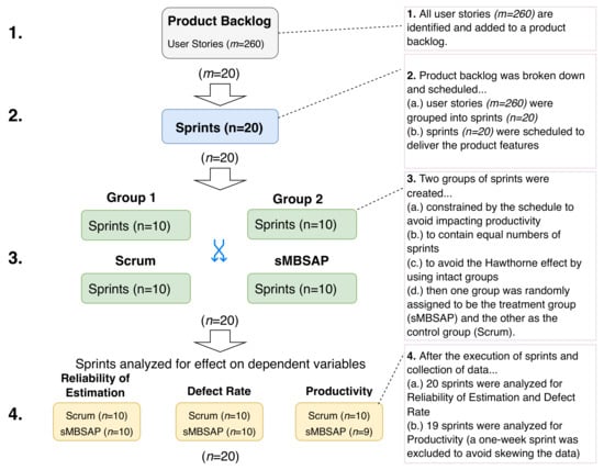 First, all user stories () were created and added to a product backlog (Step 1 in Figure 2). Bigger user stories were broken down into tasks (up to 20 tasks per user story). The user stories () were reviewed and analyzed to deliver the core system modules (groups of related functions) through sprints () (Step 2 in Figure 2). In order to create randomly assigned samples using intact clusters of sprints, all sprints () identified in Step 2 were placed into one of two heterogeneous groups (Step 3 in Figure 2). These two groups, containing equal numbers of sprints, were then randomly assigned: one to the treatment group () sMBSAP and the other to the control group () scrum. These groups were formed in order to avoid the Hawthorn effect []. Moreover, the researcher created a model that included a set of viewpoints and perspectives used for both approaches. This artifacts model was created to control one of the confounding variables, that is, “consistency of input artifacts”, by ensuring as many similarities between the sprints as possible.