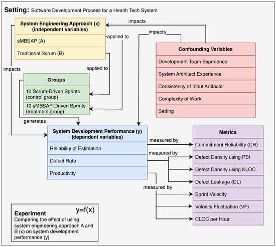 The return-on-investment (ROI) for software system development methodologies, including agile and MBSE, is commonly measured in terms of development cost, development time, impact on quality (measured in the number of defects) [], accuracy in estimation, and increased productivity []. The purpose of this research is to conduct an experiment to compare the sMBSAP [] and scrum in terms of the reliability of estimation, productivity, and defect rate. The development of a health tech system that provides dietary recommendations to users based on their health profile [] was used as a context for this experiment.