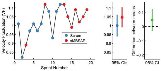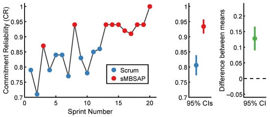 The of each sprint in chronological order is presented in Figure 4. For the scrum-driven sprints, the lowest was 0.71 for Sprint 2, while the highest was 0.86 for Sprint 2. For the sMBSAP-driven sprints, the lowest was 0.87 for Sprint 3, while the highest was 1.0 for Sprint 20. The scrum-driven sprints () were associated with a commitment reliability ratio of (). By comparison, the sMBSAP-driven sprints () were associated with a numerically larger commitment reliability ratio of (). The descriptive statistics are shown in Table 1.