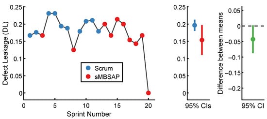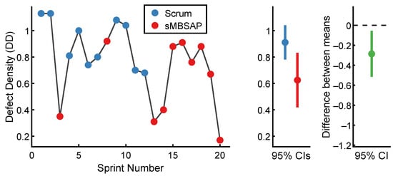 - The assumption of independence suggests that the data are gathered from groups that are independent of one another [,]. In this experiment, special consideration was given to the sequence of the sprint implementation to better ensure that the independence assumption held for the observations within each group. The independence assumption for the t-test refers to the independence of the individual observations within each group rather than the interdependencies between sprints. To best satisfy this assumption, each observation should be unconditionally unrelated and independent of the others in terms of data collection or measurement. Violations of the independence assumption, such as having repeated measures or correlated observations, can lead to biased or incorrect results when using the independent t-test. As an example from the context of this experiment, the number of defects observed in Sprint 6 (a scrum-driven sprint) was independent of that observed in Sprint 7 (also a scrum-driven sprint), and it was also independent of that observed in Sprint 9 (an sMBSAP-driven sprint). A higher or lower number of defects in Sprint 6 had no relationship to the number of defects in Sprints 7 or 8, although there was a schedule interdependency between the three sprints. In summary, while the sprints may have had scheduling dependencies, given that the observations within each group were generally independent of each other, the assumption of independence was tenable for the independent t-test.