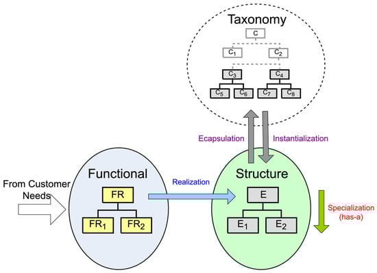 A functional requirement (FR), which presents the designer’s abstract wish—what the designer wants from the system—is the element in the functional space. It is chosen by the designer to satisfy the customer’s needs and should be described as a “to + verb”. For example, the customer wants to keep and show their photos. To fulfill this, a function can be “to save the photo files”. While the FR is decided, top-down specialization decomposes the upper-level FR into a sub-level FR. This top-down specialization maintains “abstraction” and all FRs form a hierarchy. This hierarchy maintains a “has-a” or “part-of” relationship.