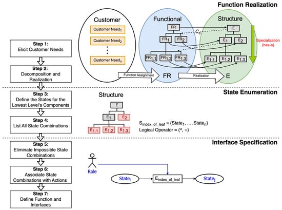In Step 6, states should be associated with actions first. Then, functions and interfaces should be defined accordingly. When the designer thinks of functions and actions, they determine who can perform those actions or functions. This step starts with identifying events, processes, or operations that will change an entity’s state. A role is an actor (e.g., system or user) who permits the execution of a function or an event on the entity. For example, we can identify a sensor’s state change from the “system” (role) “detecting the voltage change” (event) on a “sensor” (entity). In the last step, Step 7, according to the specified events or functions, the team further defines interfaces, parameters, and data for communications between internal parts or external systems.