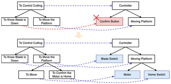 Figure 3 shows how the team, using the SSSDA approach, performed the zigzagging maneuver to lay out the embedded software’s entities (i.e., modules). The top-down force for driving specification enabled the team to gain specific details for functional requirements and design entities. During the zigzagging operations, the team understood that the higher-level entities might not have had any implementations and those entities presented a group of sub-entities. When the team decided on what entity should be used to realize the functional requirement, the team selected from a list of candidates. For example, for the functional requirement—“to know the blade is down”—the team could select a “confirmation button” or a “blade switch” as the design entity to satisfy the requirement. In the team’s final design result, the team chose a “blade switch” to detect if the blade’s position was down.