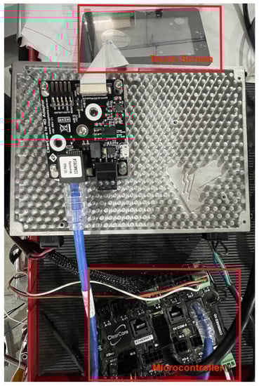 Microcontroller and touch screen of the semi-automatic bandsaw system.