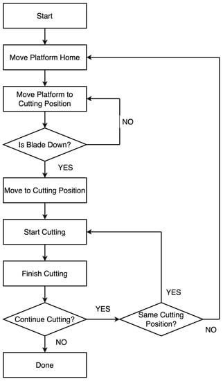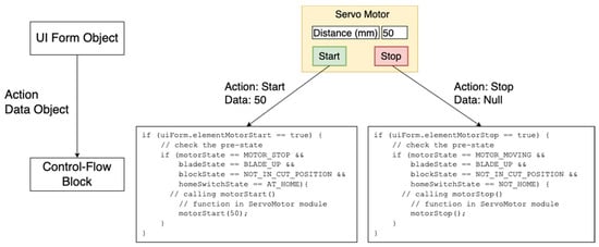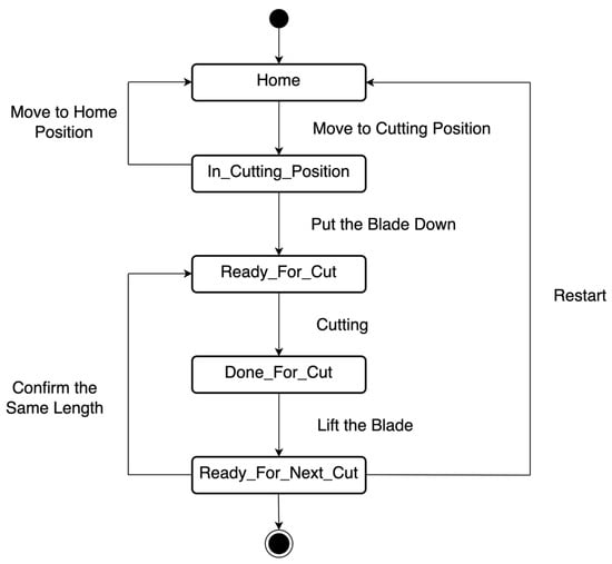 Table 1 shows the entities and their corresponding states from Figure 3. The design entity in the real-world implementation may be associated with a component that provides events, functions, or triggers. For example, a motor component provides “move” and “stop” functions. In the design result, the blade position sensor is a digital trigger that sends out 0 and 1 to indicate “open” and “close” so that the system can detect if the blade is down (i.e., close) or up (i.e., open). The team identified the states of the blade position sensor as BLADE_DOWN and BLADE_UP. Regarding the home position sensor, instead of using a digital one, the team selected an analog trigger because position detection with higher precision was expected. The voltage change due to the trigger was recorded in the microcontroller board. This voltage change was translated to states AT_HOME and NOT_HOME. The motor’s states considered two key factors in the system design, moving and positioning. The motor could stop or move at any location. Since the cutting position is the one that the system cares about, to interpret this, the motor’s states could be further divided into MOTOR_STOPPED, MOTOR_MOVING, IN_CUT_POSITION, and NOT_IN_CUT_POSITION.