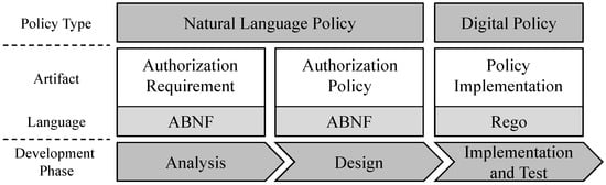 Figure 1 provides an overview of the introduced artifacts in the respective development phases. The authorization requirement is an NLP which is created in the analysis phase. To create an authorization requirement, we propose an Augmented Backus–Naur Form (ABNF) providing a structure for natural, human-readable sentences. With the design phase, the knowledge regarding authorization is more consolidated and the relevant ABAC terms (e.g., subject and object) are known. Therefore, we introduce an artifact authorization policy which is a further defined authorization requirement containing the building blocks for the digital policy. Similar to the authorization requirement, we propose an ABNF containing more structured rules to create a further structured authorization policy. Thus, we classify an authorization policy as a natural language policy and an intermediate artifact to a digital policy. Finally, in the implementation and test phase, the authorization policy is transformed into a digital policy by implementing the policy using Rego.
