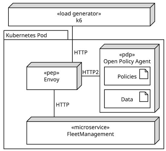 54]. Envoy forwards the request to the PDP Open Policy Agent which holds the authorization policies from Listing 12. The OPA evaluates the request and returns the result to Envoy. Depending on the result, the request is routed to the microservice FleetManagement. If the result is positive, Envoy can add additional headers to the request if necessary such as in the authorization policy in line 11 of Listing 12. The final node is the load generator k6, which allows writing load tests using JavaScript.