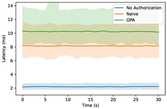 Table 5. Throughout the load tests, the containers were assigned to the same Kubernetes node to ensure consistent latency. The PostgreSQL database (v15.2) has four CPU cores and 20 GB of RAM. The microservice FleetMangement has three CPU cores and 5 GB of RAM. The Envoy proxy (v1.23) has 2.5 CPU cores and 5 GB of RAM. OPA (v0.51.0) has 2.5 CPU cores and 5 GB of RAM. Finally, to avoid bottlenecks at the load generator k6 (v0.43.1), six CPU cores and 20 GB of RAM were allocated. During the load tests, the load on the allocated resources was monitored and found to be sufficient to perform 100 requests per second without running into a resource bottleneck. The database is populated with 2500 users for the experiment. Each user is responsible for four fleets, for a total of 10,000 fleets. Each fleet contains four cars. For the baseline implementation of the microservice FleetManagement, the database contains only four fleets with four cars each. Otherwise, the microservice would return all 10,000 fleets, resulting in incomparable results.