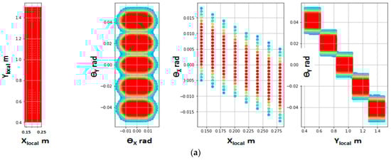 The beam particle distributions (phase diagrams) in a 4-dimensional space across the beam axis (X, Y, ϴx, and ϴy) are shown in Figure 4a,b—for the IOS exit plane and for the NBI port plane (window size 30 × 60 cm2). The main feature that distinguishes the BTR approach from the existing NBI models is that BTR calculates the injected beam statistics not only with a detailed account of the source beamlet structure but also including the effects of background conditions (fields and gas); as a result, BTR generally provides a complete and more ‘realistic’ beam losses and transmission through the injector as compared to the NBI models which typically ignore all these minor effects. However, the combination of these effects tends to be far from negligible, so during the experiments, the need for a more realistic simulation becomes more evident [30,31].