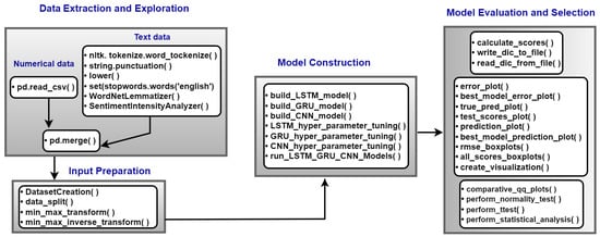 In the first stage, various functions access numerical and text data from the intended sources. Functions such as from Pandas library [72] are utilized to read the numerical data, while unstructured data are cleaned up using functions such as , , and extracted from the library [73]. Furthermore, we rely on the that uses the VEDER package [74] to calculate sentiment scores of the unstructured data. These scores are combined with numerical data through the function by the index date.
