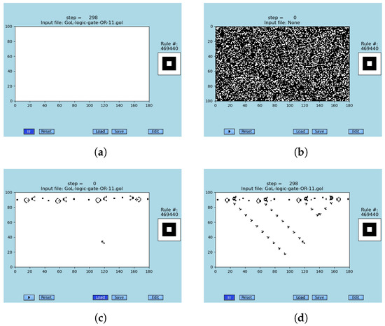 The principles of CA simulations and emergence are explained in the simulation of the cellular automaton ‘Game of Life’ [4,29]: (a) empty matrix, step #298; (b) random matrix, step #0; (c) predefined initial configuration, step #0; and (d) simulation of the case ‘c’, step #298. Those simulations are not error-resilient. (a) No output: an empty matrix without any initialized alive cells with a embedded local rule gives empty output. (b) Random input: step #0, a matrix with a random initial configuration; the local rule will lead to the evolution. (c) The logic-gate OR: the initial configuration at step #0; see [79] for animations. (d) The logic-gate OR: the configuration at step #298; see [79] for animations.