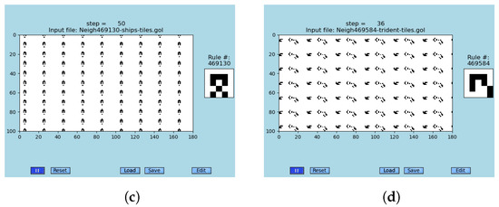 The definition of ’Game of Life’ using eight nearest neighbors (N, NE, E, SE, S, SW, W, and NW) is shown in [27]. Many emergent structures are observed there; some examples follow. Additionally, we know that replication and self-replication are observed in biology and chemistry [69,70,71], which deserves greater attention. The above reasons motivated the study of generalized versions of GoL [28,29], with results presented in this review, see the text.