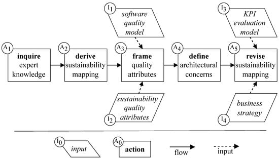 Process illustrating the abstract concepts containing actions (–) to perform the sustainability analysis and inputs (–) to support the actions.
