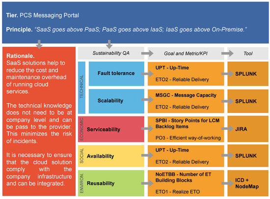 As described, the conceptual tiers were used to create a high-level abstraction of the PCS solution. By executing research Phase I and conducting the first interview session, the driving architecture principles according to these tiers were derived and are presented in Table 3. Throughout our research, they were used to (i) distil sustainability QAs, (ii) map KPIs, and (iii) depict suitable tools to measure the impact on sustainability.