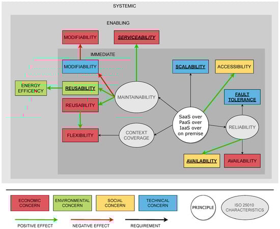 Condori-Fernandez and Lago [20] characterized traditional quality attributes (QAs) according to the ISO/IEC 25010 SQuaRE [26] standard and identified their contribution to sustainability. The output is two-fold: (i) all ISO/IEC 25010 QAs are mapped onto the four sustainability dimensions to create a Sustainability–Quality (SQ) model, and (ii) dependencies between the QAs and dimensions are uncovered and quantified by providing a set of dependency matrixes (D-matrix). The SQ model offers the possibility of expressing QAs related to a particular software project and of defining the individual characteristics and their impact on the sustainability dimensions. By defining the D-matrix, a QA can either have a contribution in two different dimensions (inter-dependency) or it can relate to a different QA within the same dimension (intra-dependency). The follow-up research from Condori-Fernandez et al. [19] combined the contributions outlined above in the form of the sustainability-quality assessment framework (SAF) toolkit [21]. The SAF-Toolkit also incorporates decision maps (DMs) [27] to provide software architects with the necessary tools to holistically support decision making from a software sustainability perspective. We made use of the SAF-Toolkit as part of our sustainability analysis and for defining sustainability QAs for architecture principles in a standardized way.