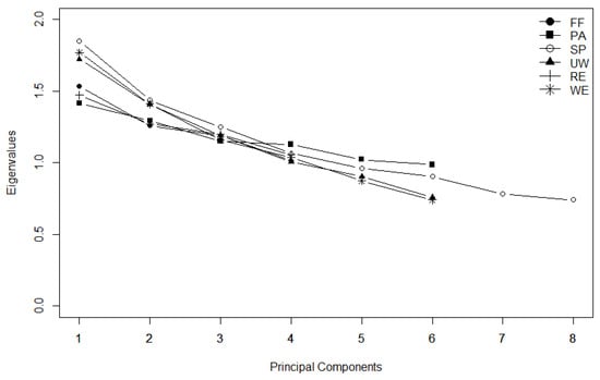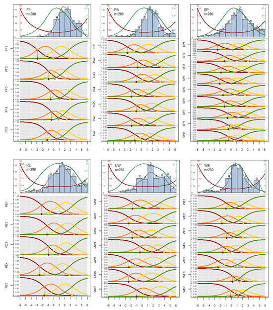 Table 1 shows the descriptive item statistics and the Cronbach’s alpha, along with its 95% confidence interval (following the procedure in []) for each subscale. There was a tendency towards agreement across all the items (all item means > 1.5 except for WE7), with the highest mean agreement for FF2, with MFF2 = 2.25. All the items were shown to have discriminatory power () ≥ 0.44. The internal consistency is good to excellent for all the subscales, with the lowest value of 0.743 for the FF scale (5 items) and the highest value of 0.931 for the SP scale (9 items). In view of the different subscale lengths, we consider the internal consistencies satisfactory.