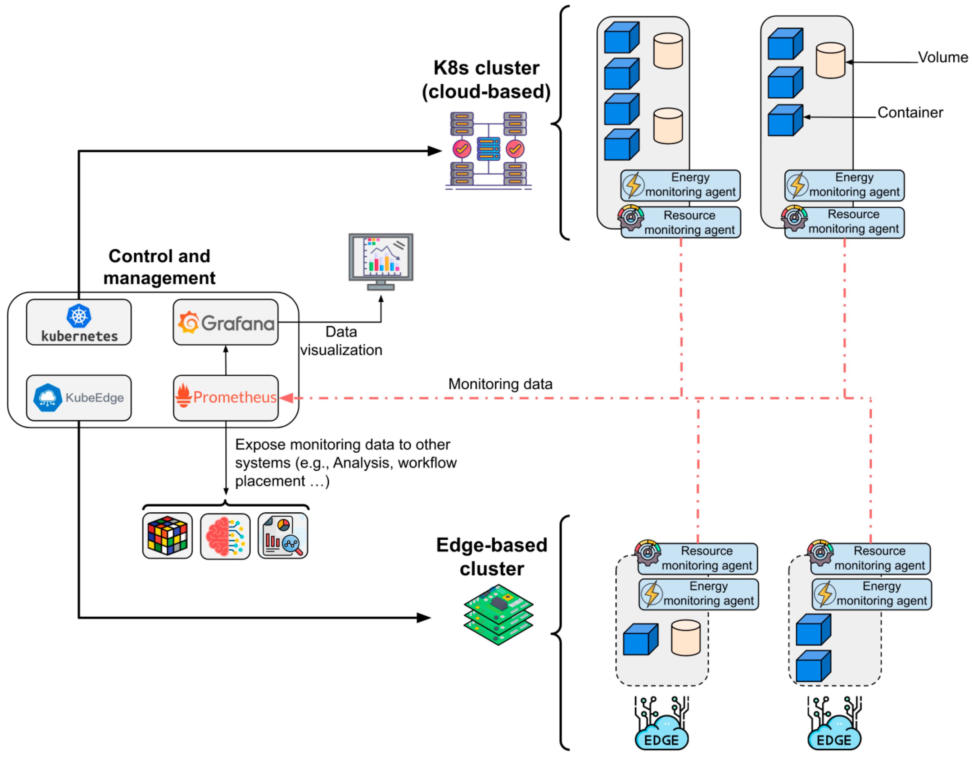 Together, these architectures form the IoT–edge–cloud continuum, an ecosystem that integrates powerful cloud data centers with energy-efficient, low-latency, low-resources devices close to data sources [9]. This continuum is ideal for AI-driven workloads, where IoT devices generate and collect raw data and the cloud handles data-intensive analytics, with edge servers acting as an intermediate layer. However, orchestrating this heterogeneous ecosystem presents challenges, including the dynamic management of distributed computing, storage, and network resources. Effective orchestration is critical to reducing energy consumption, latency, and message congestion while ensuring secure and efficient data handling in large-scale IoT scenarios.