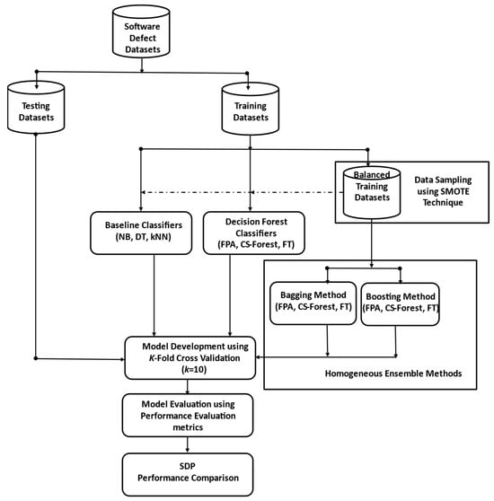 Additionally, enhanced DF models utilizing diverse homogeneous ensemble techniques are proposed. The main advantage of homogeneous ensembles is their ability to reduce variance, improve generalization, and maintain simplicity, making them a powerful and practical approach for boosting model performance without introducing the complexity of heterogeneous ensembles [40,41]. They are particularly well suited for problems requiring scalability, interpretability, and robustness to overfitting. Hence, homogeneous ensemble methods are proposed to enhance the predictive performance of DF models, thereby producing robust and generalizable SDP models. The synthetic minority over-sampling technique (SMOTE) is utilized as an effective method to address the latent class imbalance issue in software defect datasets [20,31].