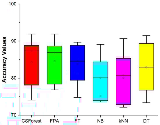 In comparison to the baseline models, the DF models had comparable accuracy values. In most cases, the DF models recorded superior prediction accuracy values when compared to the baseline classifiers. For example, on the CM1 dataset, the least and best DF models (FT and CSForest, respectively) have accuracy values of 83.49% and 87.16%, respectively, which are +2.63% and +7.14% increments over the best baseline model, NB, with an accuracy value of 81.35%. On average across all the datasets, the DF models recorded better accuracy values compared to the baseline models. Specifically, FPA recorded a consistent performance across all the datasets with an average accuracy value of 84.61%, followed by CSForest (84.33%) and FT (83.79%), respectively. It is worthy to note that the baseline models also had good results with DT having the best average accuracy value of 82.9%. However, their accuracy values are less than the values of the DF models. Figure 2 presents the box-plot representation of the accuracy values of the DF models and the baseline models indicating variability of the accuracy values.