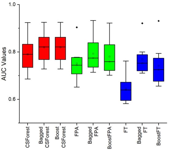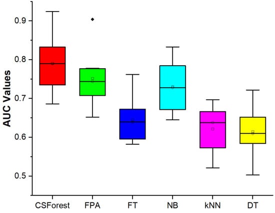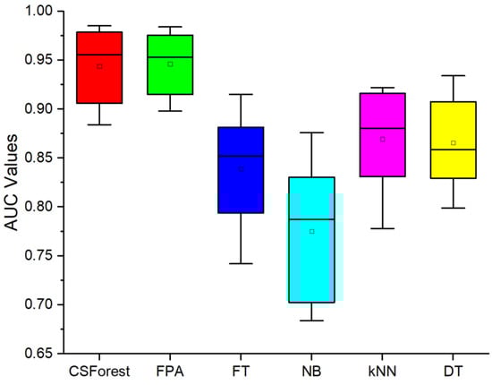 To provide a comprehensive evaluation, Figure 2 illustrates the variability in accuracy using box-plot representations of the DF and baseline models. Despite good results from baseline models, the DF models demonstrated superior consistency and predictive performance. Given the frequent imbalance in software defect datasets, previous research recommends the use of complementary metrics such as AUC, precision, and recall for a holistic evaluation of SDP models [18,21,29,79]. Therefore, this study also assessed the DF models and baseline classifiers using AUC metrics to offer deeper insights into their performance beyond accuracy.