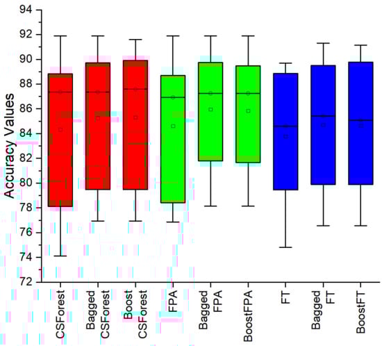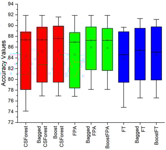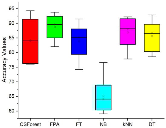 CS-Forest, as a decision forest model, operates on the principle of minimizing the total misclassification cost rather than simply maximizing overall accuracy. By incorporating cost considerations throughout training and prediction, CS-Forest is particularly effective for applications where certain misclassification errors are significantly more detrimental than others [36,37]. FT similarly arises from the functional induction of multivariate decision trees and discriminant functions. FT employs positive induction to hybridize a DT with a linear function, resulting in a DT characterized by multivariate decision nodes and leaf nodes that utilize discriminant functions for predictions [38,39]. FPA, as a decision forest model, modifies the traditional Random Forest (RF) framework to prioritize and penalize attributes based on their predictive utility or impact on classification performance. Its working principle revolves around dynamically penalizing or weighting attributes during the construction of DTs to improve classification performance, especially for class imbalanced problems [34,35].