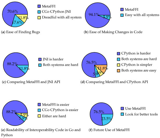 To validate the architecture and implementation of MetaFFI, we built and tested it on both Ubuntu and Windows, with full-duplex plugins for three distinct programming languages: Python (CPython) as an interpreted language, Java (OpenJDK/Hotspot) as a JIT-based VM language, and Go as a compiled, memory-managed language with limited support for C-FFI and embedding. We confirmed correctness using a comprehensive suite of unit and system tests, including tests against third-party libraries such as BeautifulSoup (https://www.crummy.com/software/BeautifulSoup/, accessed on 22 August 2025), Pandas (https://pandas.pydata.org/, accessed on 22 August 2025), NumPy (https://numpy.org/, accessed on 22 August 2025), GoMCache (https://github.com/eko/gocache, accessed on 22 August 2025), and log4j (https://logging.apache.org/log4j/, accessed on 22 August 2025). Performance comparisons were conducted to make sure the overhead is not prohibitive. Usability was evaluated through an empirical user study, described in Section 7, which demonstrated substantial improvements in developer experience using MetaFFI.