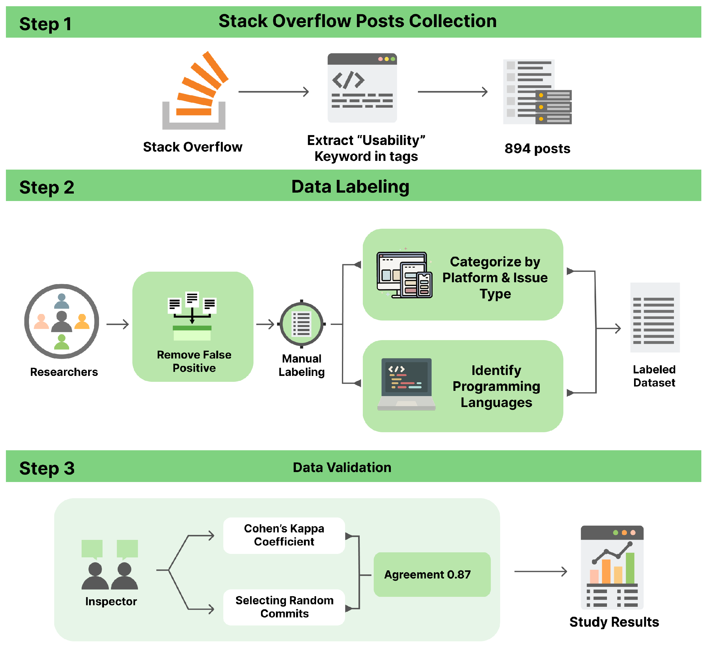 13]. We extracted 894 Stack Overflow posts tagged with usability, examining the temporal changes in discussion volume and engagement and comparing these patterns to other non-functional requirements (NFRs). We also investigated how usability challenges occur across different programming languages and platforms. Specifically, we address the following research questions: