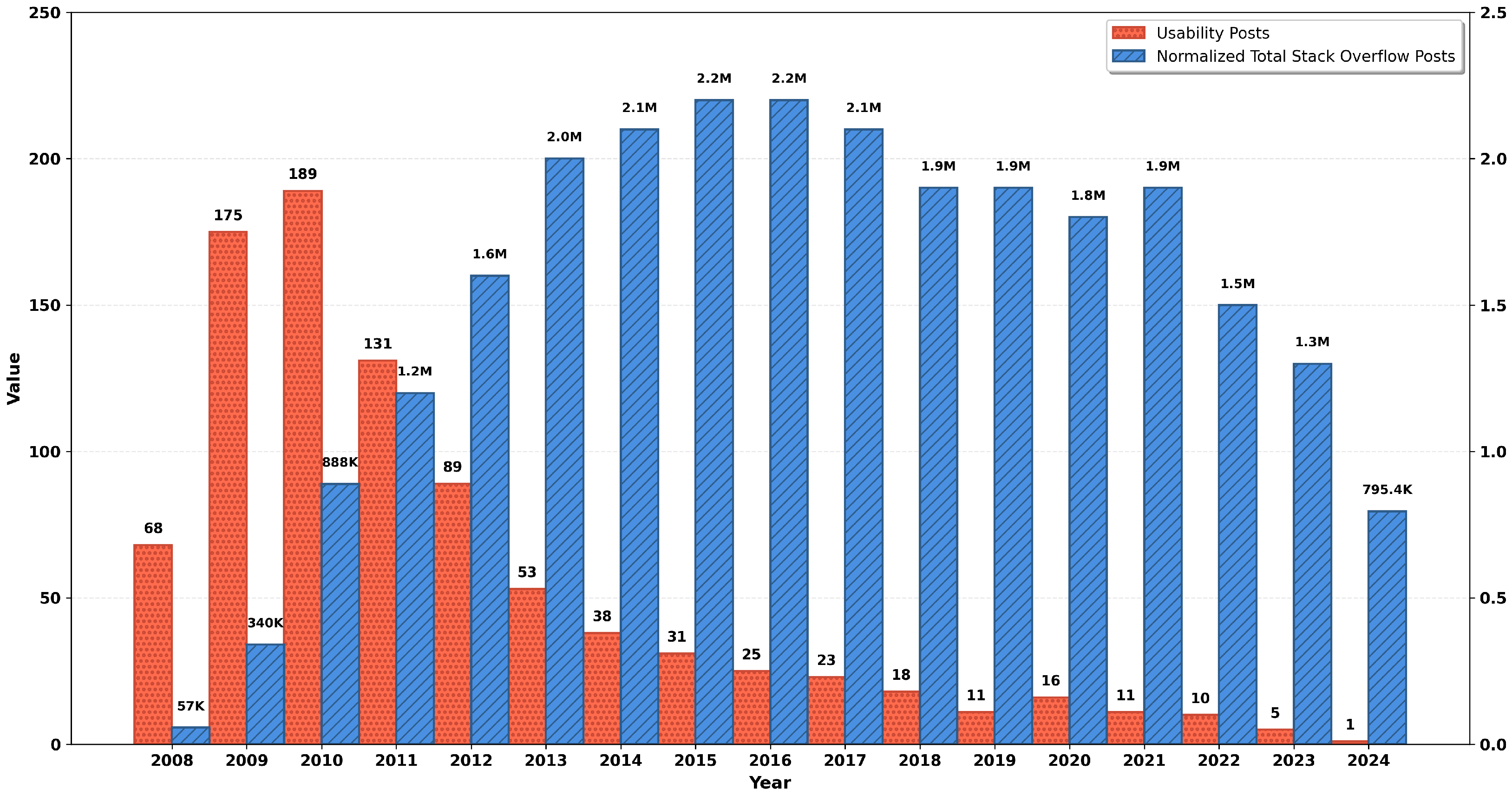 To confirm whether this decline is domain-specific or reflects general Stack Overflow activity patterns, we examined usability posts in relation to the overall platform posts. As shown in