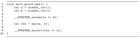Consider the code in Figure 2 (for more realistic example see, e.g., [9]). It establishes that a,b are unconstrained integers s.t. a >= b. At the end, it asserts that res (the result of max(a, b)) should be equal to a (which is correct as a is the larger integer). Running CBMC on this code (assuming a correct implementation of max is referenced) will yield that no values of a and b can be found such that the assertion fails, and thus the functionality is verified.