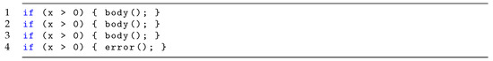 The bounded part of bounded model checking means that the model is made finite, to ensure model checking will terminate. Loop unrolling is a common technique to turn a program with loops, which has an unbounded number of states, into a program without loops. In principle, loop unrolling takes a loop, converts it to an if statement, and then copies it x times. This leads to a program that is semantically equivalent to the original one, as long as the loop would not be taken more than x times. To guarantee that the chosen x is not too small, unwinding assertions can be added, i.e., after the last copy of the loop the condition is checked one more time, and if it holds an error is raised. Unwinding is illustrated in Figure 3, with the original loop, and Figure 4, with an unwinding of and including an unwinding assertion.
