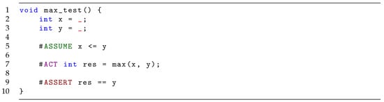 We begin by introducing the syntax of a test. It is a C function that returns void and accepts no parameters. It is prefaced by the #BEGINTEST statement to mark the function as a rich test. A test can contain ordinary C code with the addition of the #ASSUME, #ACT and #ASSERT statements as well as non-deterministic assignment. In general, all assumes will come before the (single) act, which is followed by a (single) assert. A test should be interpreted as follows: All code coming before the act is the arrange phase of the test. Assignments may include assigning of _ (an underscore) signifying a non-deterministic assignment. #ASSUME expr states that expr is assumed to hold from this line onwards, meaning that any non-deterministic variables are restricted to those fulfilling the expression. If no such assignments exist, the test is aborted (but not failing). The act line has no special semantics but is used to identify the line of the test’s act phase. Finally, the #ASSERT expr checks that the expression does indeed hold; if it does not, the test fails.