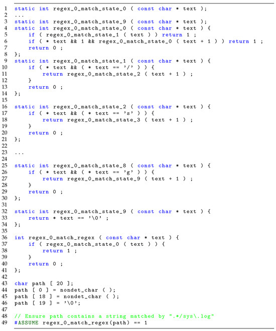 Consider the regex statement #REGEX name 7 .*/sys\.log ; it will be transformed into code, as shown in Figure 15. The #ASSUME on line 56 ensures that afterwards the variable path contains a string that adheres to the regular expression.