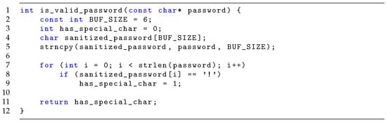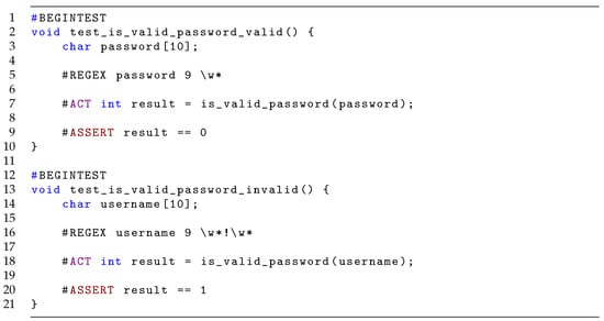 Consider the simple function is_valid_username in Figure 16, which recognizes that a valid password must contain at least one special character, here simplified as in containing an exclamation mark (!). It uses a buffer where it copies the password before checking it. There is a software bug on line 1 where BUF_SIZE is set to 6 instead of the length of password. To test such a function, we wish to check the two cases, a valid password and an invalid password. To check the invalid case, we provide a regex that contains only alphanumeric characters, shown in the top half of Figure 17. The valid case is checked by a password containing a single exclamation mark, shown in the bottom half of Figure 17.