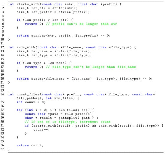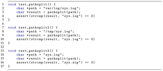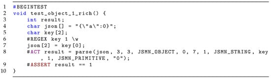 In this section, we present the application of rUnit to the jsmn JSON parser (https://github.com/zserge/jsmn/ (accessed on 5 December 2025)). It is a lightweight parsing library written in C representing a widely used piece of code (over 800 forks on GitHub) onto which we apply rich test analysis (commit 25647e692c7906b96ffd2b05ca54c097948e879c). jsmn includes a set of tests in different categories, reported in Table 3, as well as a typical test (Figure 23), checking that the JSON {a :0} is parsed correctly.