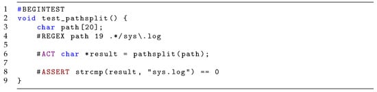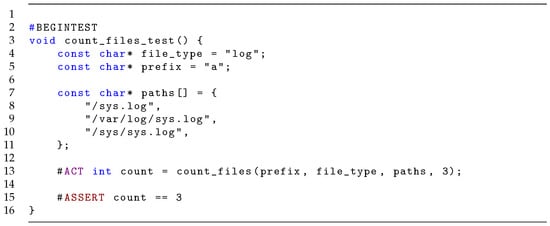 In practice, tests are not described as mathematical functions but in source code (e.g., in C). Given semantics for a programming language, there is a natural translation function from source code to mathematical functions that maps each phase to a function corresponding to its effect. We do not go into detail about that here, since it is beyond the scope of this paper, but assume the existence of the translation (in practice this is provided by a back-end). To ensure that source code adheres to the format of arrange, act and assert in Definition 2, we restrict tests in source code to follow a strict template. We will here present the template in C, but it could be defined for a different language as well.