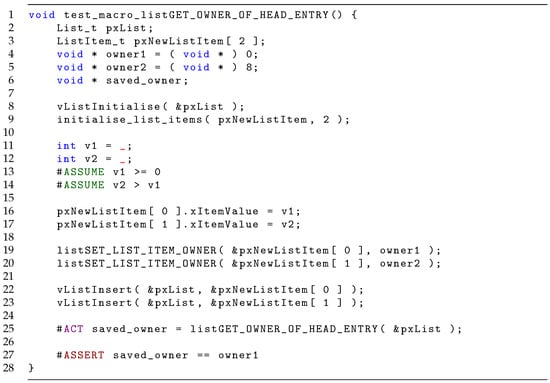 FreeRTOS includes a linked list data structure with unit tests (https://github.com/FreeRTOS/FreeRTOS/blob/main/FreeRTOS/Test/CMock/list/list_utest.c (accessed on 5 December 2025)). We have converted these tests to rich tests (a few were omitted where translation was impossible due to technical limitations). A typical test is shown in Figure 22, where a macro returning owner of the head entry in the list is checked. We have chosen to present this test as it illustrates an important point of clarity. Note lines 11–14 where the values to be inserted into the list are assigned. In the original test, these values were set to v1 = 0 and v2 = 1, respectively. With the constant values, it is not obvious if they have a special meaning or if any values can be chosen. In the rich variant, it is highlighted that the important property is that the second value is larger (as well as the numbers being non-negative). Compare this with the assignment of owner1 and owner2 at lines 4 and 5, whose values are completely arbitrary (if they are equal, it is impossible to distinguish the owners), and could also be changed to be non-deterministically assigned. With a rich syntax we not only achieve the testing of more values (the rich test could find bugs for specific combination of values) but also enhance the clarity in the test, clearly stating the important relationship between the two variables.
