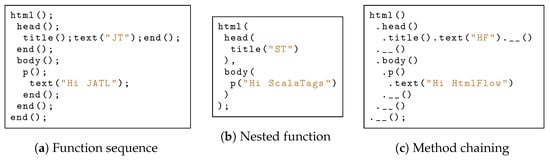 DSLs for HTML provide an API where methods or functions correspond to the names of available HTML elements. These methods, also known as builders, can be combined in a chain of calls to mimic the construction of an HTML document in a fluent manner. Martin Fowler [7] identifies three different patterns for combining functions to create a DSL: (1) function sequence; (2) nested function, and (3) method chaining, which are illustrated in the snippets of Figure 1.