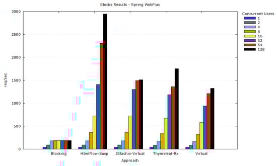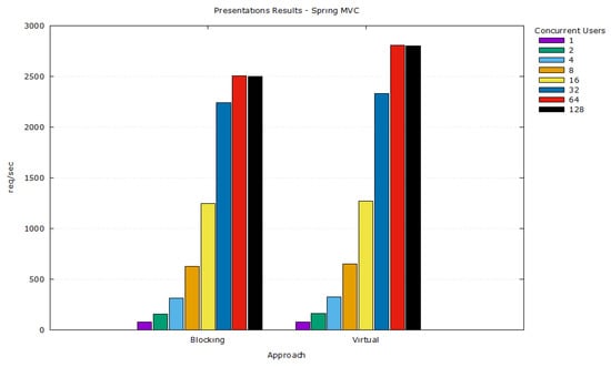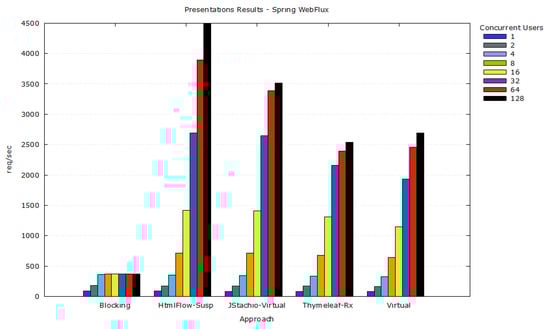 The results shown in Figure 6 indicate that the Spring MVC implementation using the blocking approach with StreamingResponseBody achieves a throughput of up to 1916 requests per second, with no significant improvement observed when using virtual threads. Both approaches scale effectively up to 64 concurrent users. Although these approaches achieve higher throughput in Spring MVC than in Spring WebFlux, their overall performance remains lower than that of the reactive and suspendable approaches.