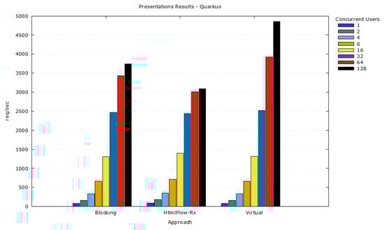 The results depicted in Figure 7 show that the Quarkus synchronous approaches scale effectively up to 128 concurrent users, achieving performance comparable to the Spring WebFlux implementation. The blocking approach reaches a throughput of 3019 requests per second, while the virtual threads approach achieves a throughput of 3357 requests per second. In addition to the synchronous engines, the HtmlFlow-Rx approach also achieves a throughput of 1760 requests per second, indicating that this approach achieves lower performance in Quarkus than in Spring WebFlux, where it reached 3026 requests per second, as previously mentioned.
