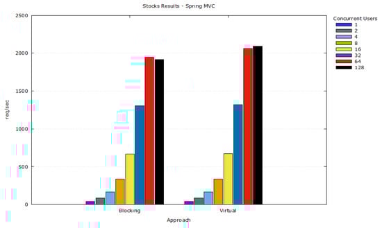 In traditional thread-per-request architectures, each incoming request is handled by a dedicated thread. The web server maintains a thread pool from which a thread is assigned to handle each request. As the load increases, the number of active threads can grow rapidly, potentially exhausting the pool. This can lead to performance and scalability issues, as the system may become bogged down by context switching and thread management overhead [36]. In the Java ecosystem, Spring MVC is one of the most widely used frameworks that follow this model, according to several reports such as the Stack Overflow 2024 Developer Survey (https://survey.stackoverflow.co/2024/technology#1-web-frameworks-and-technologies, accessed on 29 May 2025).