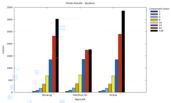 The work of Navarro et al. [47] focused on the performance of Quarkus, which relies on Eclipse Vert.x [48], itself built on top of Netty [49]. This represents a similar environment to the one evaluated in our experiments with Quarkus. Their study also emphasized template rendering, using a blocking HTML template engine (Qute). The benchmark they employed is the Fortunes test (https://www.techempower.com/benchmarks, accessed on 29 May 2025), which involves rendering a simple HTML table with only two data bindings per row.
